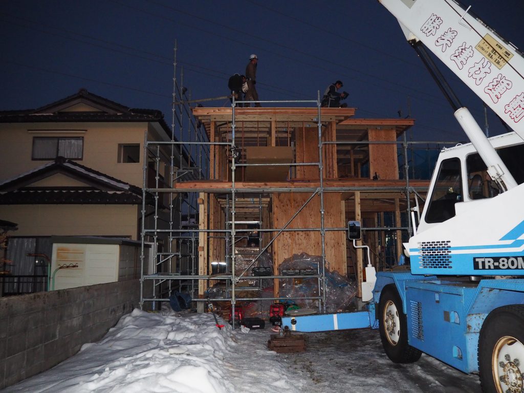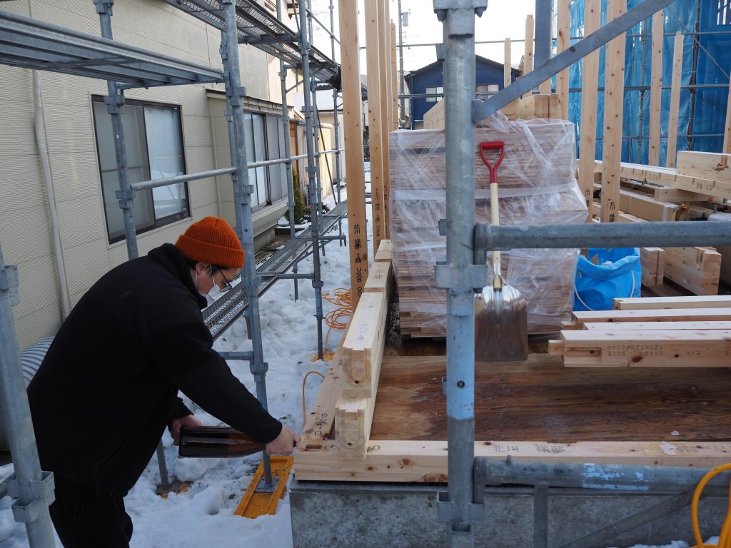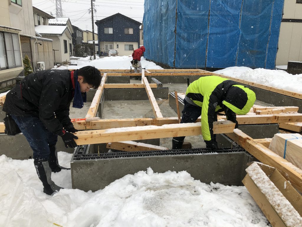 まだ雪が深々と降る中、現場の大工さんは土台伏せをしていました。