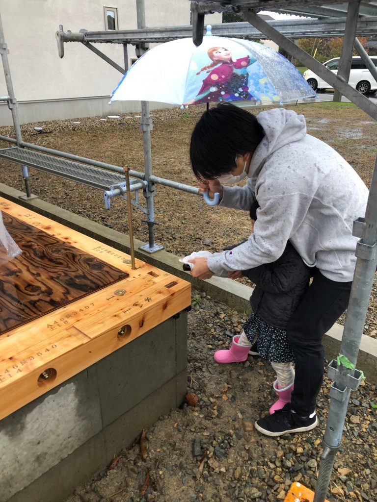 お子さんと一緒にお神酒をまいて頂きました^^雨の中、お父さんと一緒に頑張ってくれました!