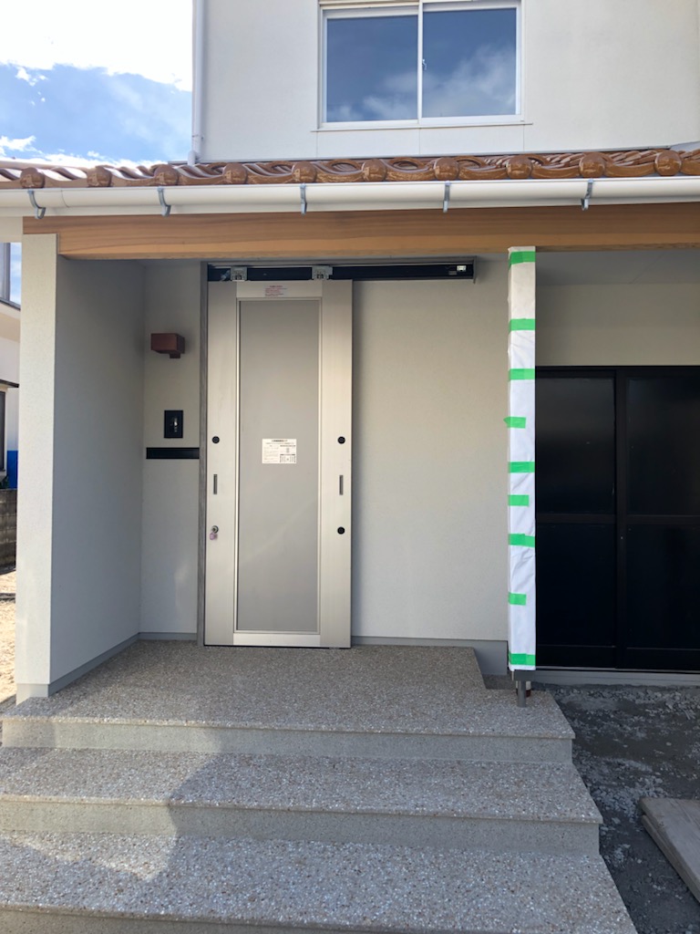 まだ仮の玄関戸ですが風除スペースをなくしドアから片引き戸に替え全体がスッキリとした印象です。