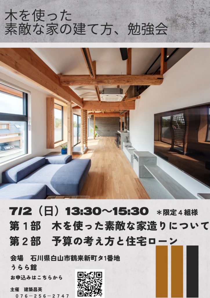 今週の日曜日、7/2(日)の13:30~15:30に、家づくりの勉強会を行います。
