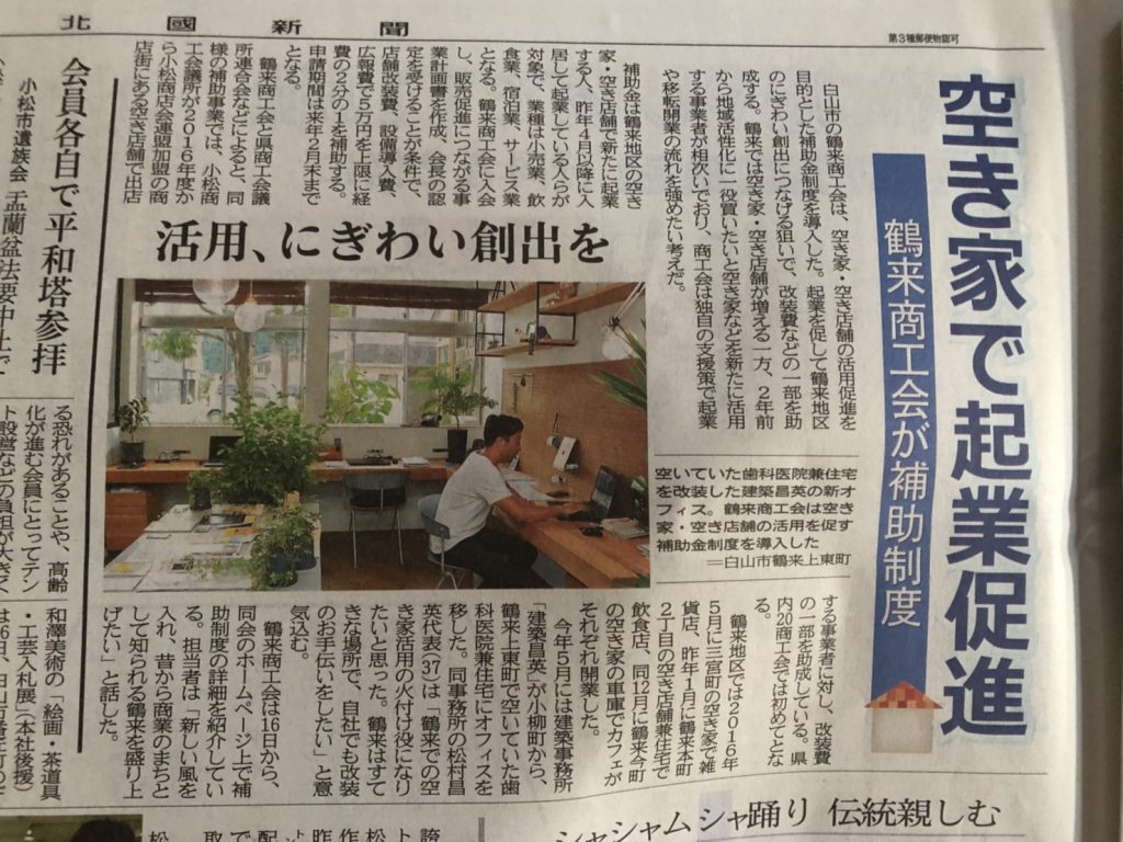 DIARY 2018-08-27 新聞に掲載されました 8月17日の北國新聞に、建築昌英の事務所が掲載されました。 元々歯科医院だった建物をリノベーションして事務所を開設したため、空き家活用への補助金制度を利用させていただきました。 鶴来には、空き家・空き店舗になっている所が増加しています。 昔ながらの趣あるそれらが上手く活用され、町が活気付き、また事業者にとってもメリットのあるこの制度がたくさん使われたらいいなと思います。