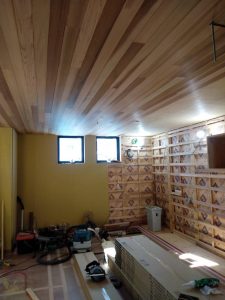 羽目板張りのダイニングキッチンの天井も施工が進んでいます。