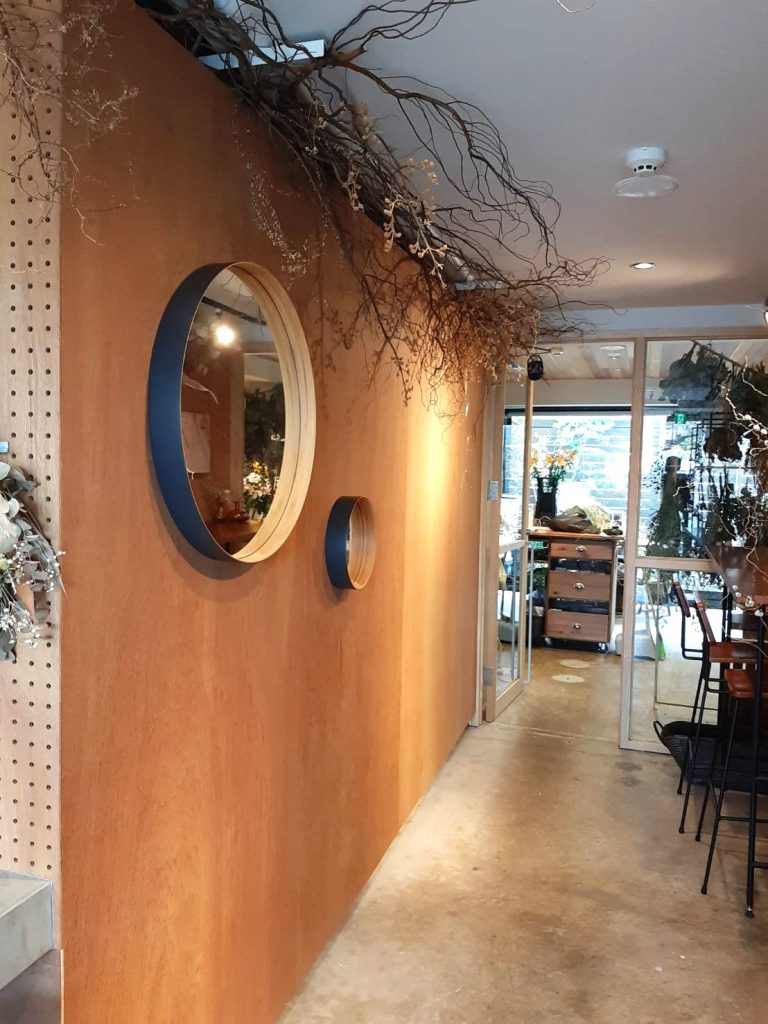 壁面上部に飾られたヴォリュームある枝も鏡に映りこみ、遊び心のある空間となりました。