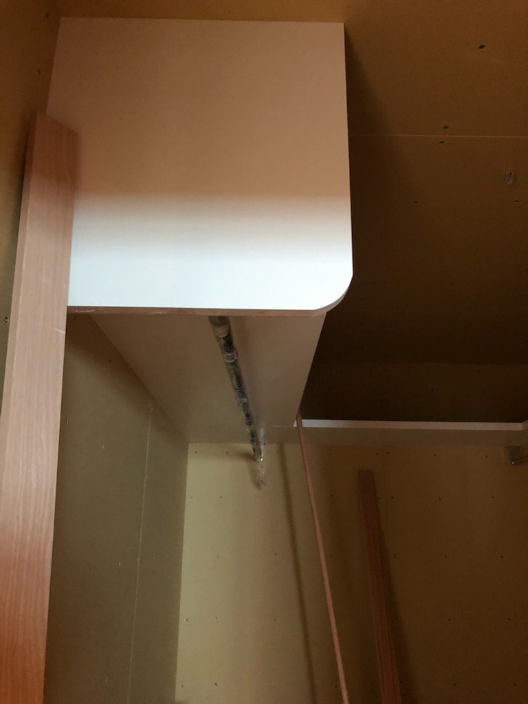 ウォークインクローゼットの入口上の棚の角を丸くした棟梁。