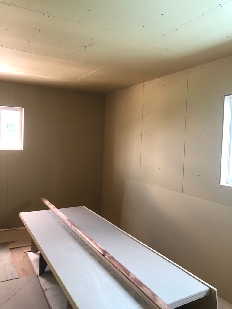 中はボード貼りが進められていて間取りや実際の広さが分かりやすくなりました。