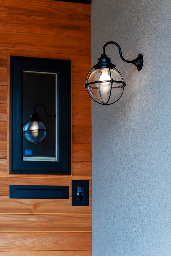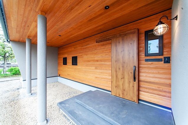 外壁はメインにモルタル掻き落とし、アプローチには杉板張りを採用しました。