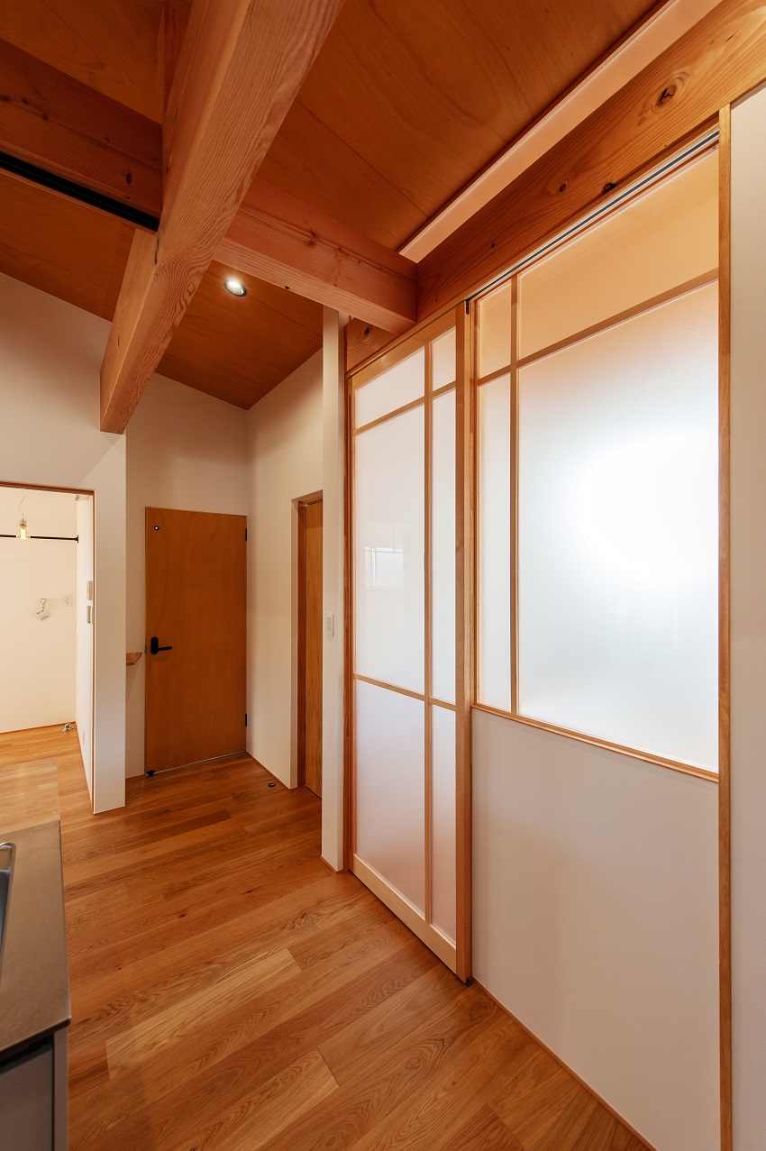 LDK入り口も、お客様と検討に検討を重ねデザインしたこだわりの建具です。