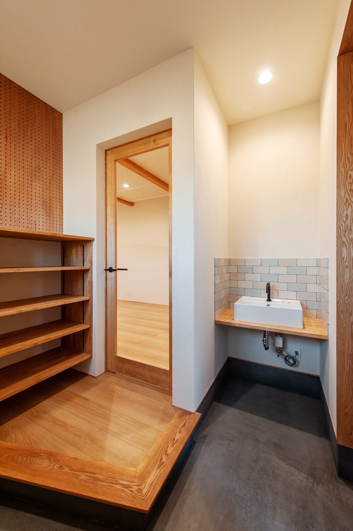 玄関横のファミリークロークには使い勝手を重視しオープンの可動棚、そして身だしなみを整える全身鏡も設置。