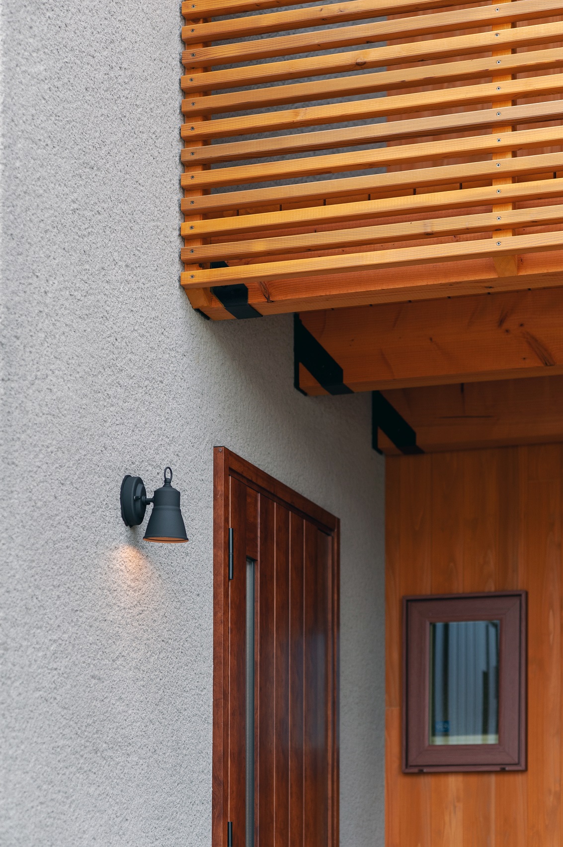 正面は左官のかき落とし壁で味わいのある雰囲気にしました。