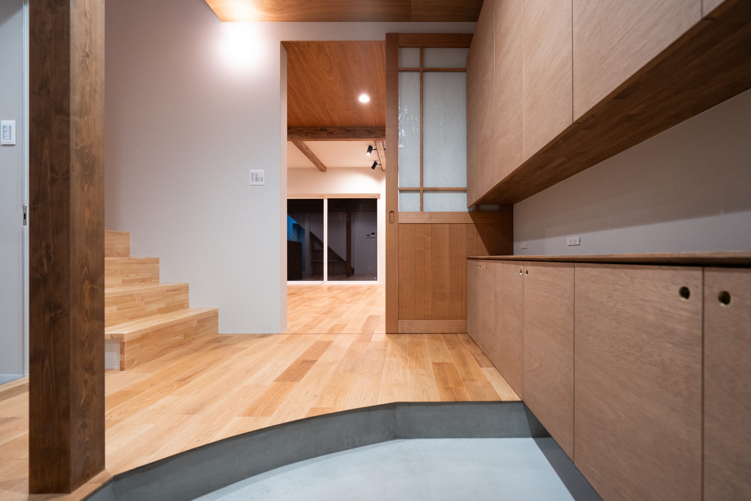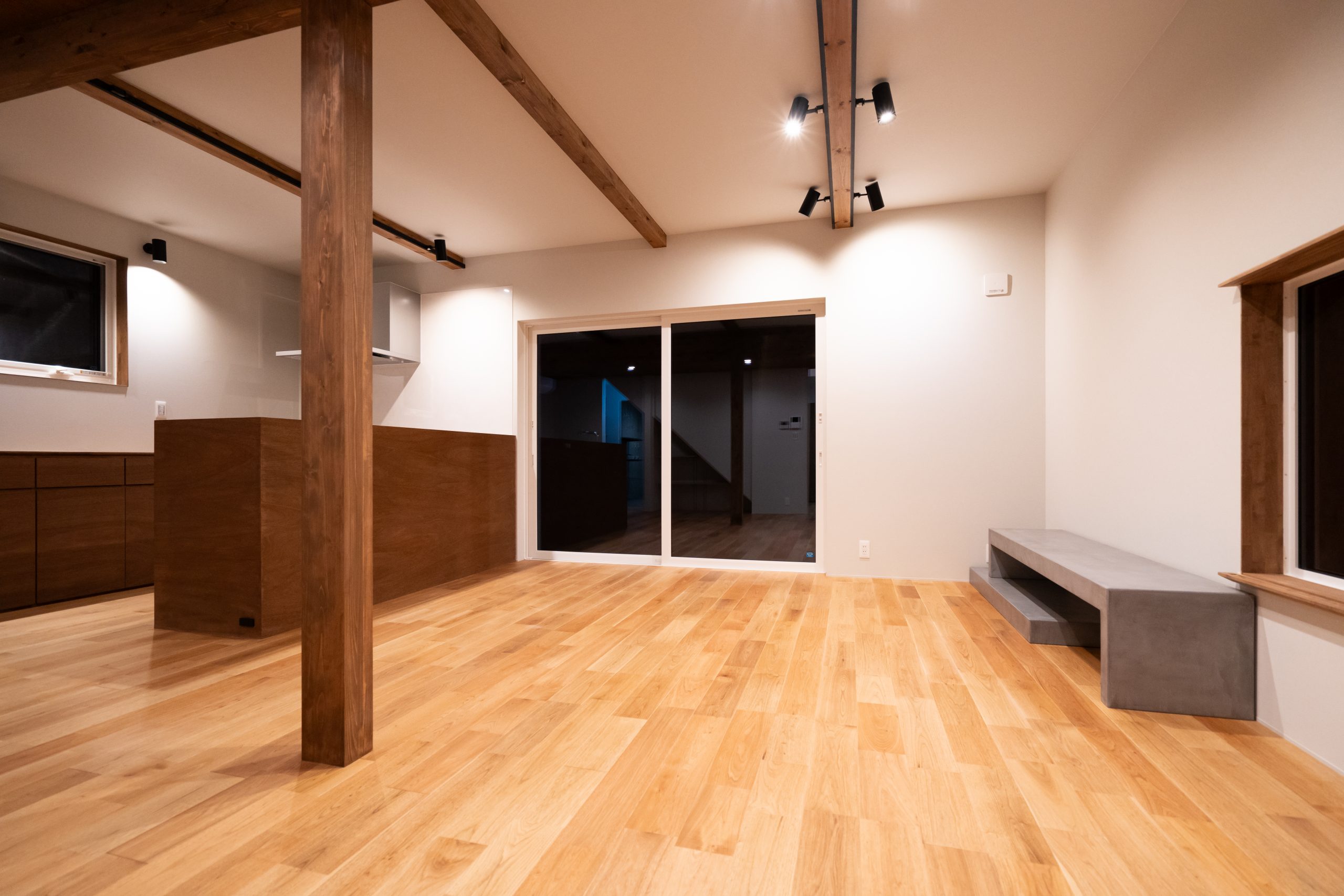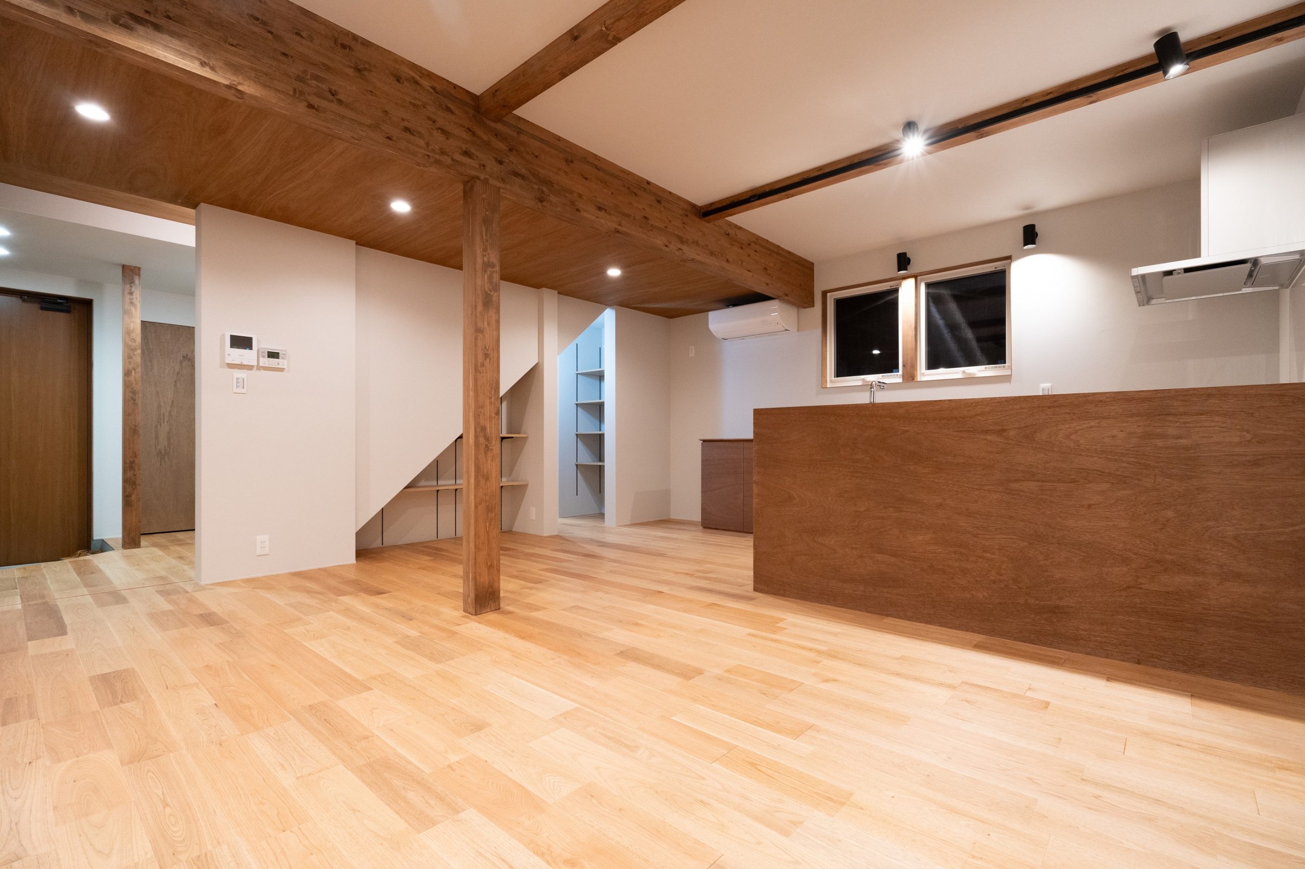 天井の高さを活動する各場所で変えることによって、居心地を重視しました。また、可動式のBOX型のテレビ台を造作で作成しました。