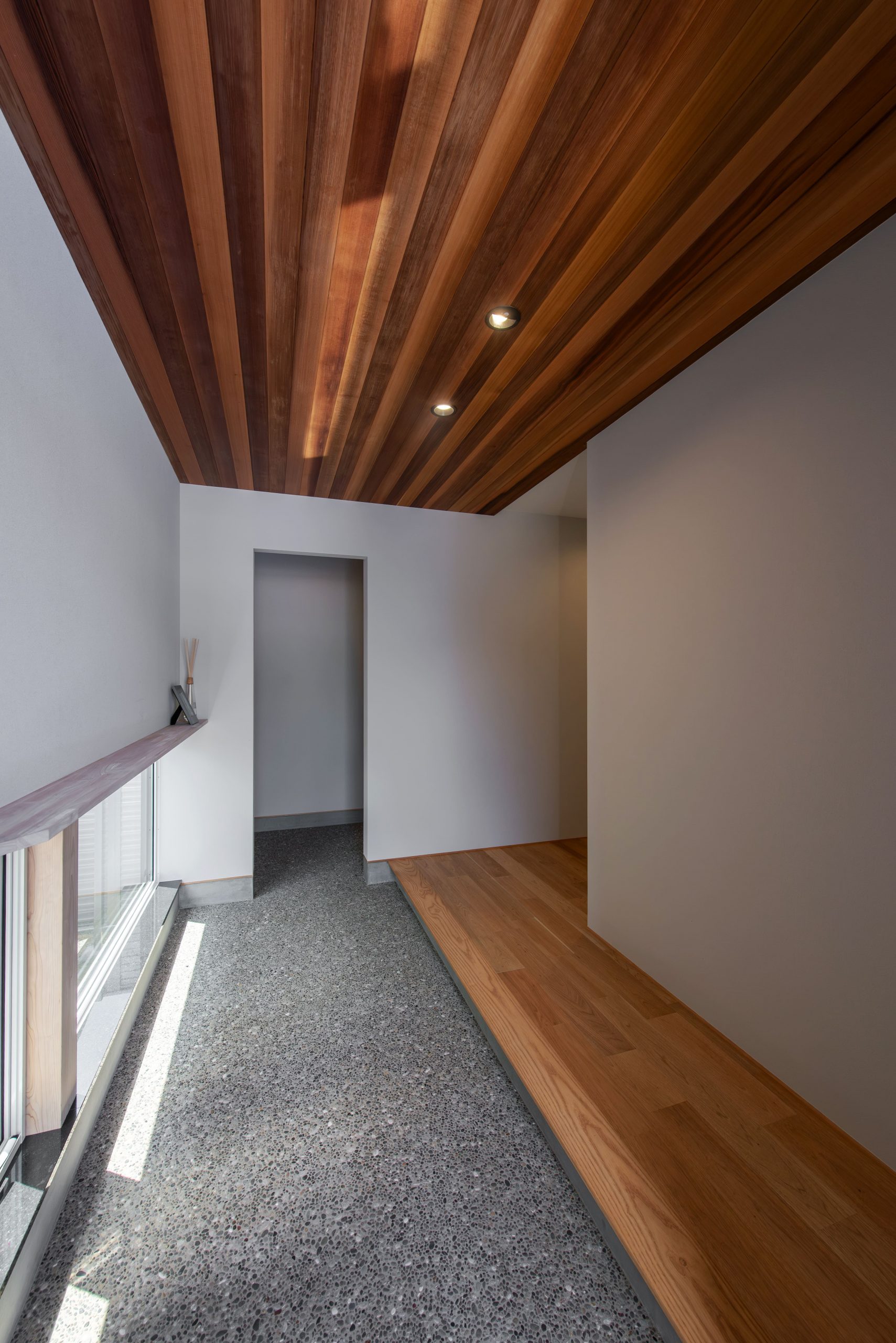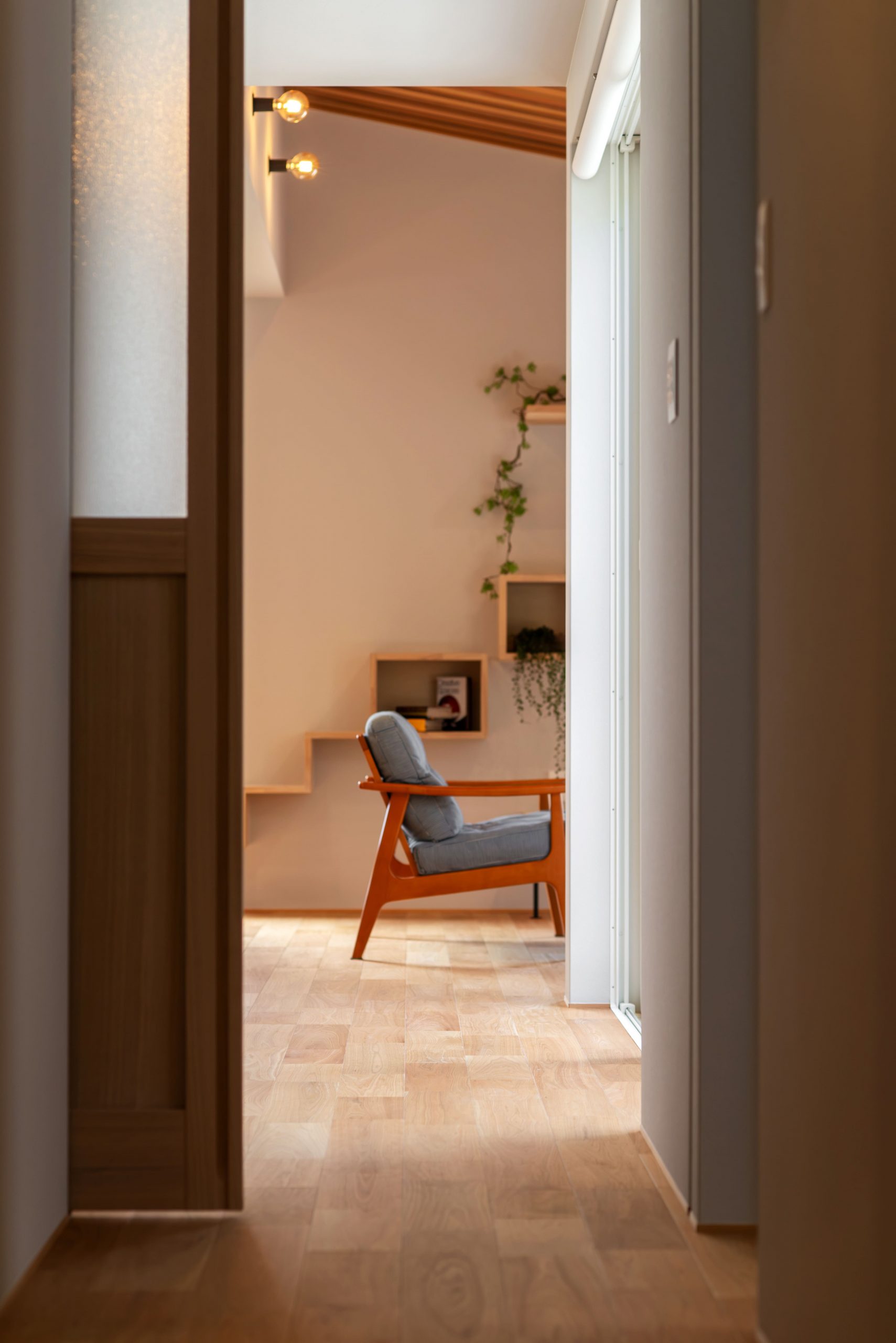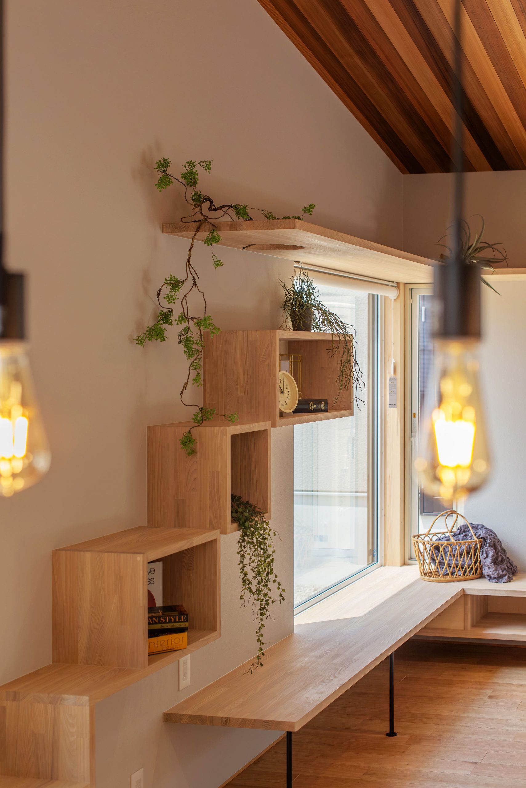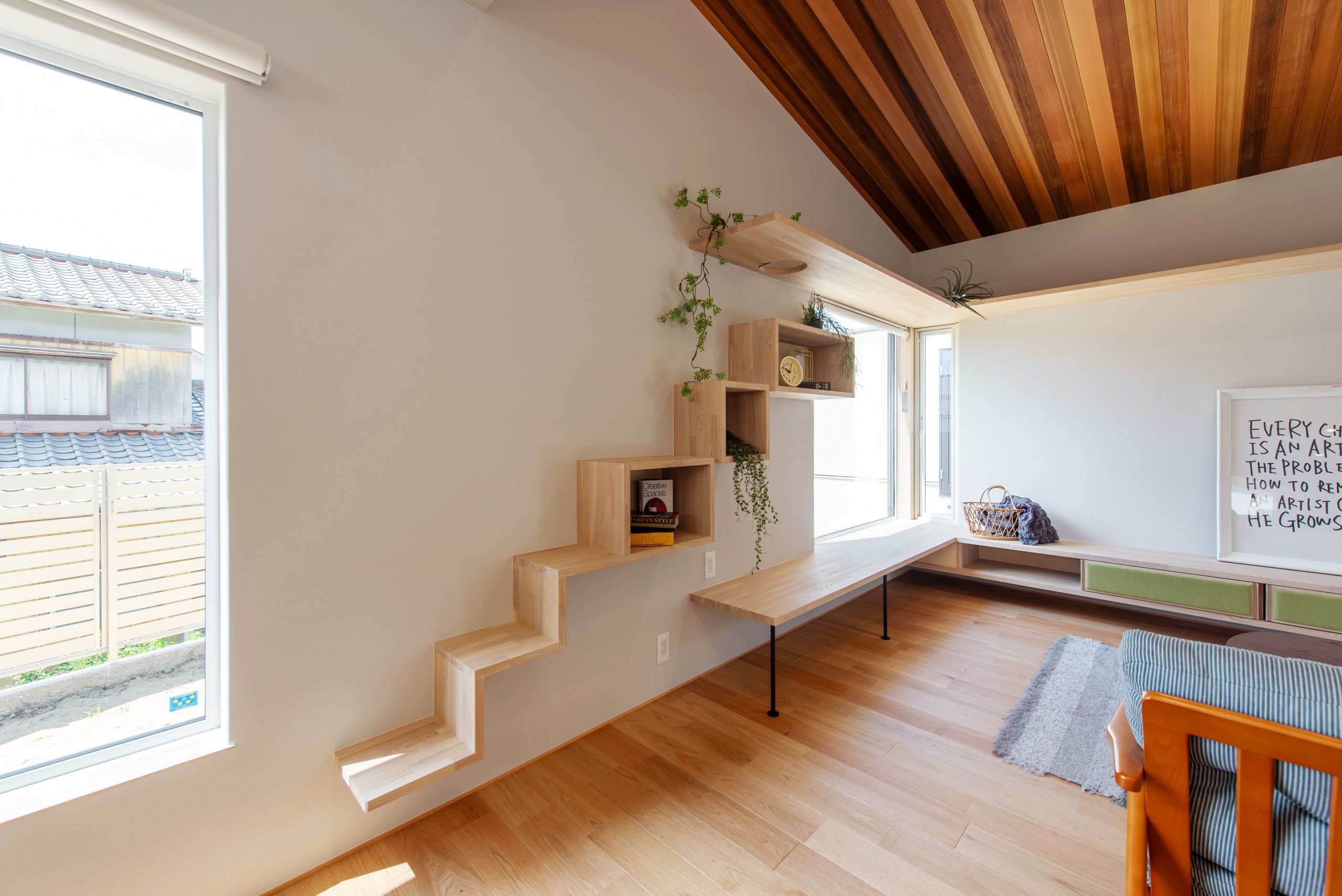 リビングの天井羽目板や将来猫を迎え入れる為に準備した、木製のキャットウォークで優しい雰囲気に。