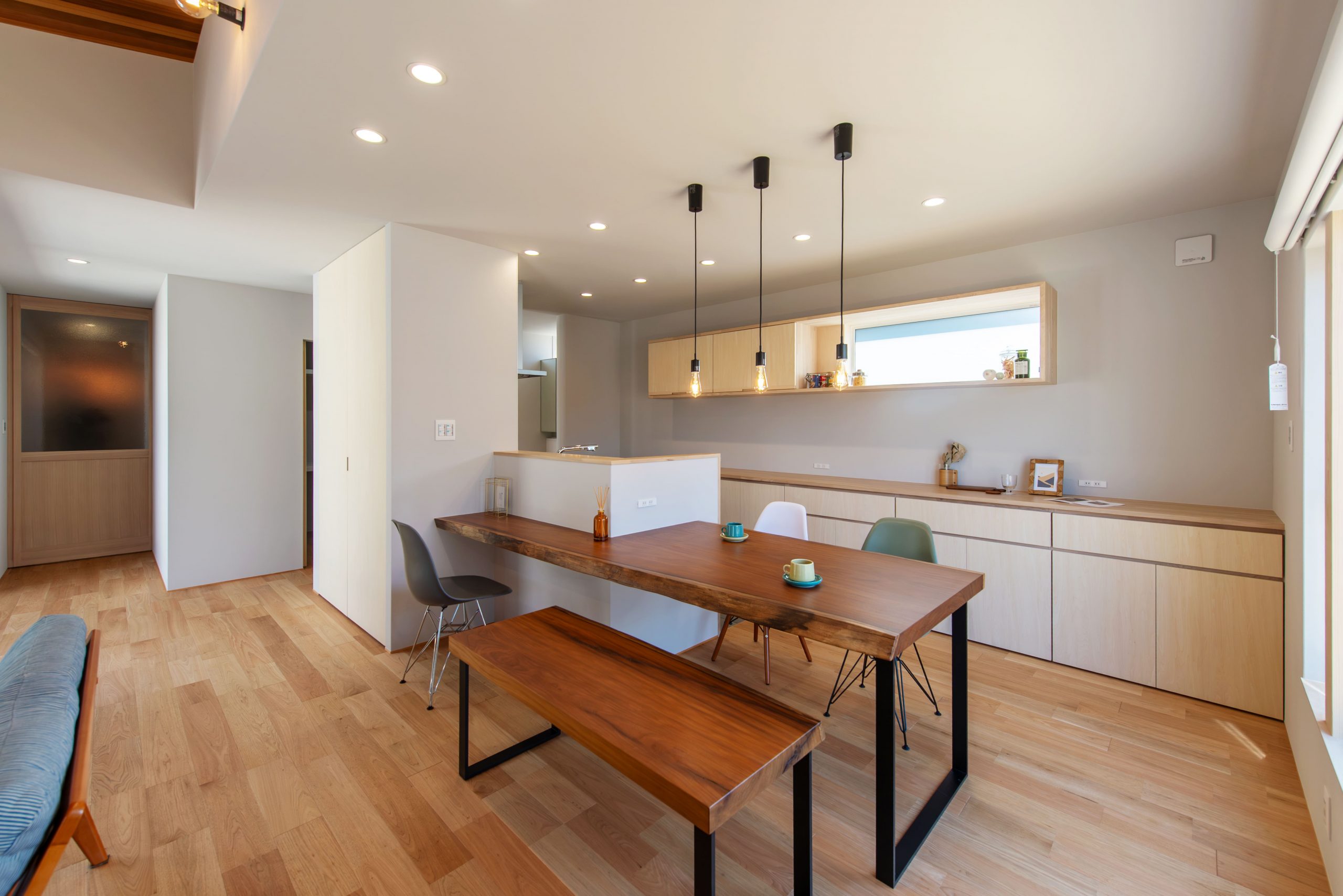 ダイニングテーブルには銘木市で見つけた無垢板を使用した造作テーブル。