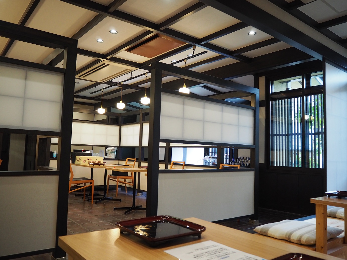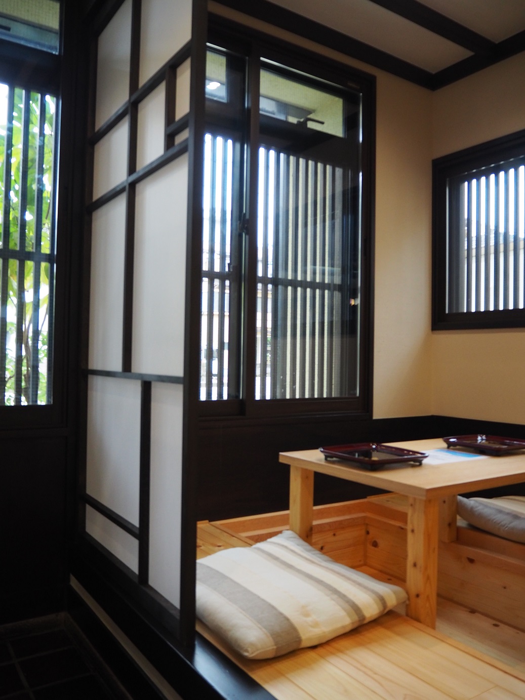 無垢材を使用した小上がり席には、外部の緑と光が差し込み、明るい空間に生まれ変わっています。